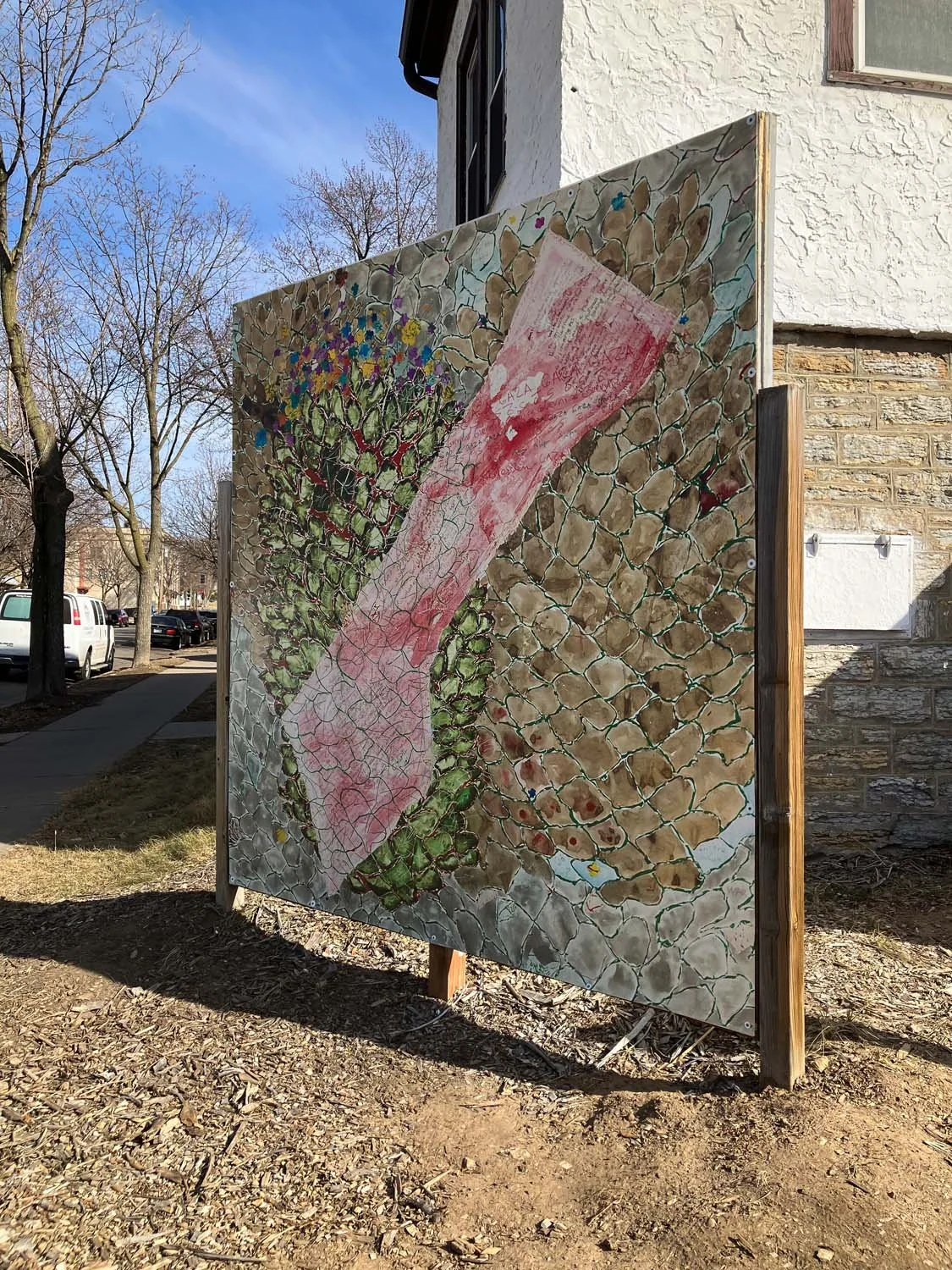 This work came about as original work to be reproduced 8’x8’ (244 cmx 244cm)image displayed publicly part of the C.E Art Board Project in St. Paul, MN. Below is conversation the I had with Jessie Fisher. The poem included in the piece is by the Palestinian poet living in Gaza Nasser Rabah and translated by the Brooklyn Translation Collective of which I am a member, can be read here. More Images also below. Images of the original work here